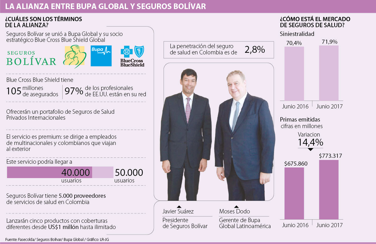 Seguros Bolívar y Bupa Global unieron esfuerzos para llevar a otro nivel la atención médica internacional. La alianza es un gana-gana: para Bupa Global, multinacional inglesa de servicios de salud, es la oportunidad de entrar al mercado colombiano; mientras que para Seguros Bolívar es la posibilidad de tener cobertura en 190 países donde su aliado está presente. Javier Suárez, presidente de la aseguradora, y Moses Dodo, gerente de Bupa Global Latinoamérica hablaron con LR sobre sus proyecciones.