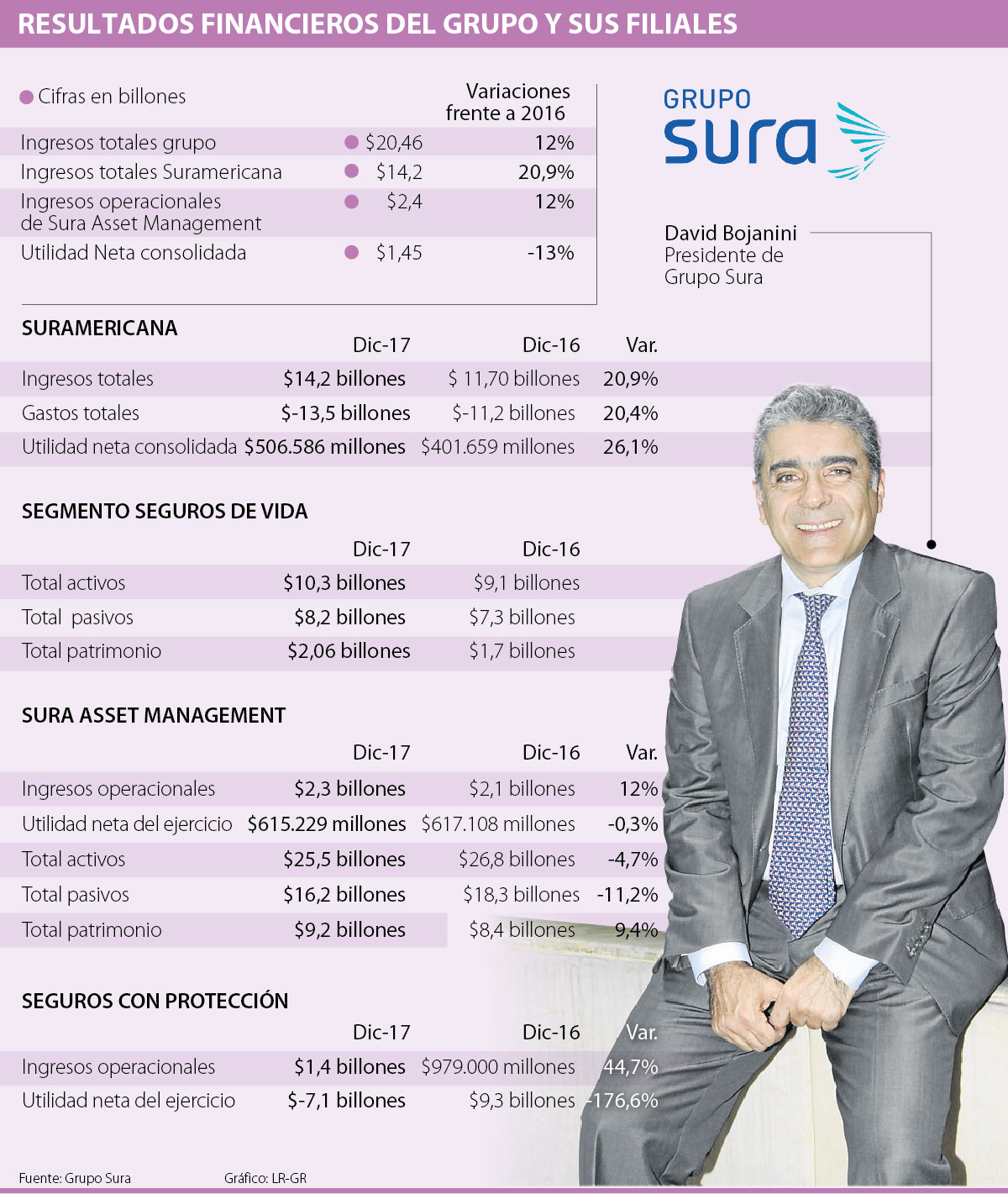 Sura Asset Management por su parte tuvo ingresos operaciones por $2,3 billones con una variación de 12% respecto a 2016 y una utilidad neta de $615.229 millones con variación negativa de 0,3%. Entre las razones de la baja en ganancias se señala la afectación por la diferencia en cambio, gastos no recurrentes y una caída por menores utilidades de Bancolombia.