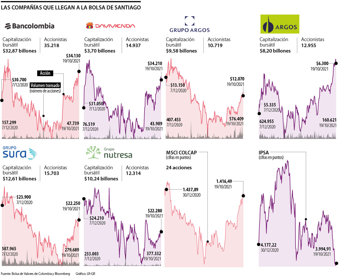 Desde hoy se podrán negociar en la Bolsa de Santiago, de Chile, las acciones de seis empresas colombianas listadas en la Bolsa de Valores de Colombia (BVC). Estas suman $77,2 billones de capitalización bursátil y 101.846 inversionistas entre sus títulos ordinarios y preferenciales. Se trata de Bancolombia, Davivienda, Grupo Argos, Cementos Argos, Grupo Sura y Grupo Nutresa.
