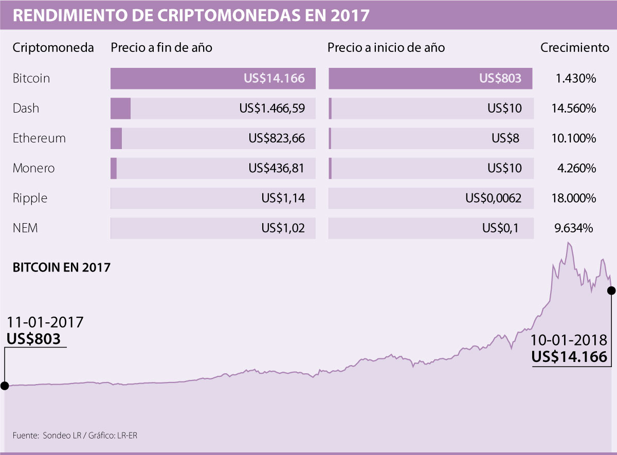 Mientras que a principios de 2017 el precio del bitcoin se acercaba a los US$1.000, en diciembre ya se cotizaba sobre US$14.166, es decir, que en lo corrido del año, la moneda virtual logró tener una valorización de más de 1.400%, a pesar de los retrocesos que tuvo en los últimos días del año.