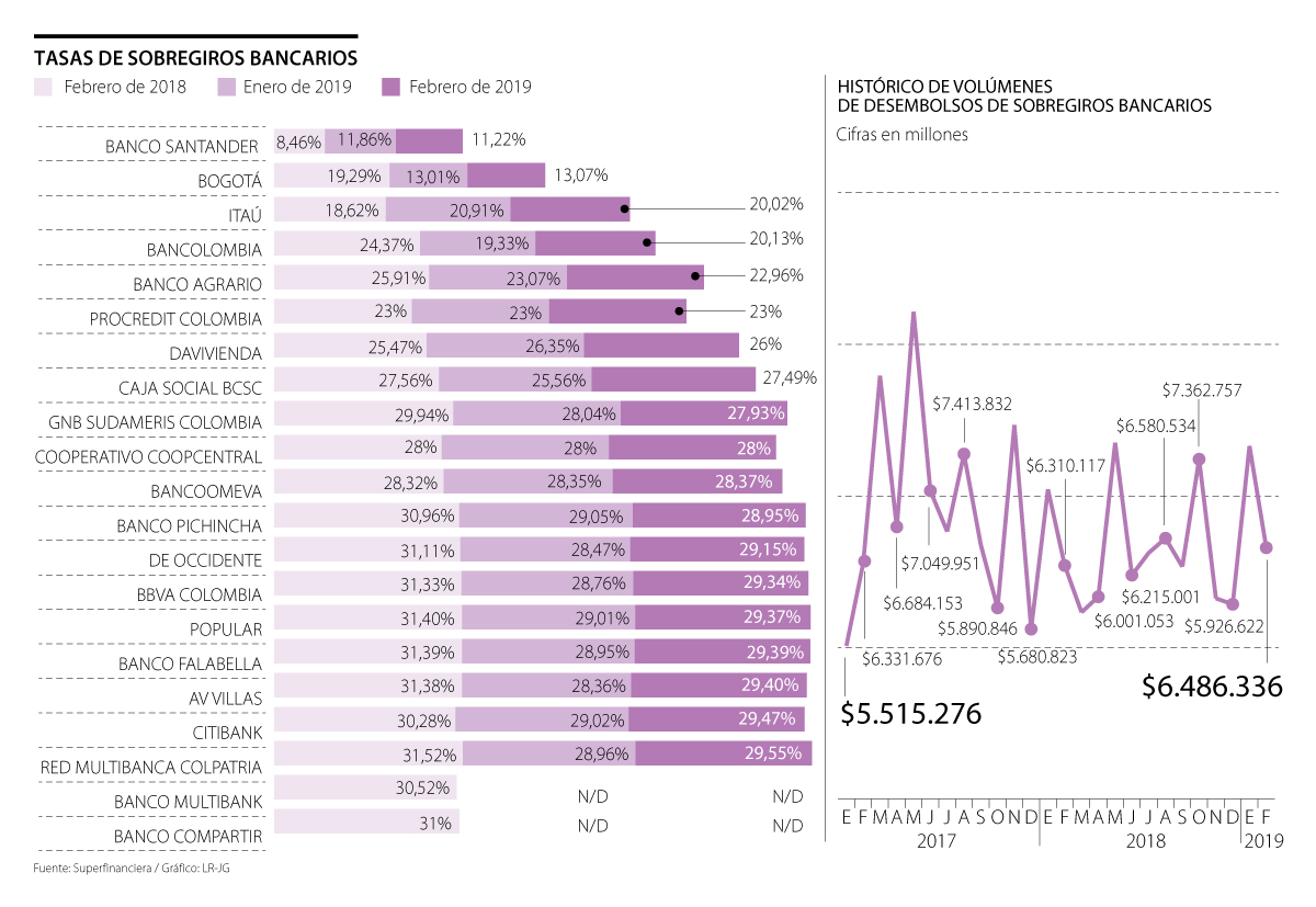 De acuerdo con el reporte mensual de tasas de interés según modalidad de crédito publicado por la Superintendencia Financiera, de los 19 bancos que ofrecían sobregiros bancarios a su clientes empresariales en febrero, Banco Santander tenía la tasa más baja, con 11,22%. Esta estaba bastante alejada de la tasa de usura, que en el segundo mes del año se ubicó en 29,55%. En enero de este año, el costo de este producto fue 11,86%, mientras que en febrero del año pasado fue 8,46%.