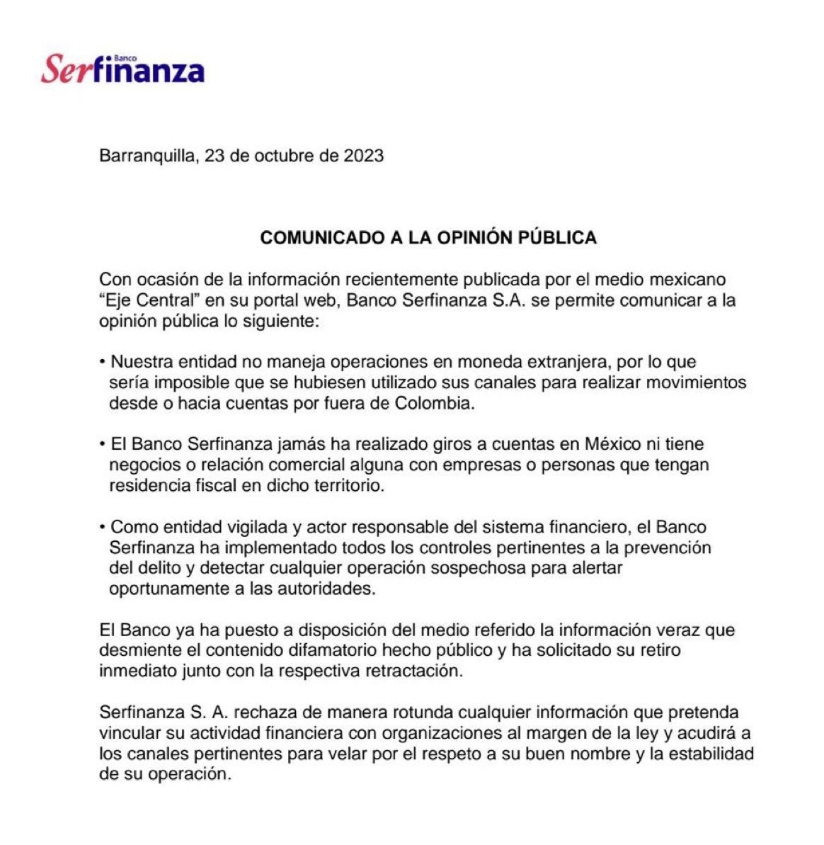 En el comunicado se expresó que el Banco "rechaza de manera rotunda cualquier información que pretenda vincular su actividad financiera con organizaciones al margen de la ley y acudirá a los canales pertinentes para velar por el respeto a su buen nombre y la estabilidad de su operación".