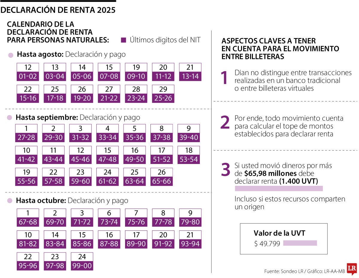 De esta manera, si en 2024 sumó más de $65,8 millones ($65.891.000) en operaciones a través de las billeteras digitales debe declarar renta así sea el mismo dinero. Este monto es el equivalente aproximado a 1.324 UVT, Unidades de Valor Tributario, que para el año 2025 tienen un valor de $49.799.
