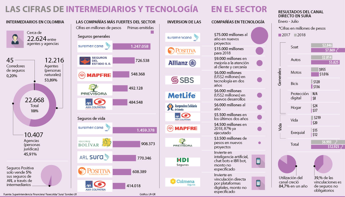Según cifras del Instituto Nacional de Seguros organismo de la Federación de Aseguradores Colombianos (Fasecolda), en el país hay actualmente cerca de 22.624 intermediarios entre agentes (personas naturales) y agencias (personas jurídicas), a los que se suman 45 corredores de seguros.