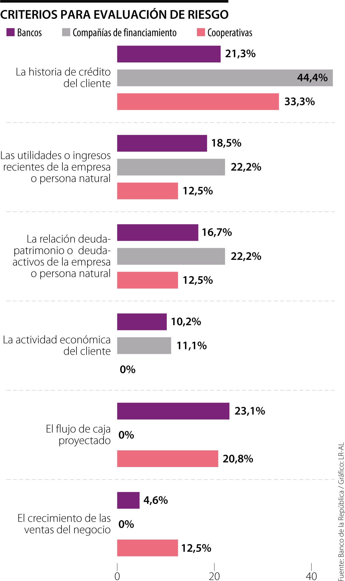 Por ejemplo, los bancos se han enfocado en el flujo de caja proyectado con 23,1%, mientras que las compañías de financiamiento (CFC) y las cooperativas se centran en el historial crediticio del cliente con 44,4% y 33,3%, respectivamente (ver gráfico).