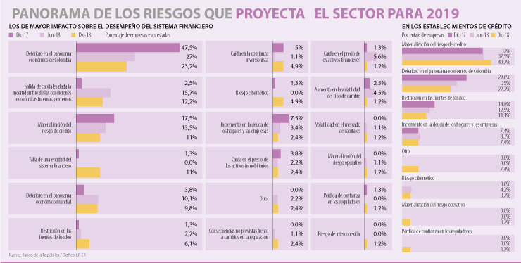 Respecto a los segmentos específicos del sistema financiero, la mayor preocupación de los establecimientos de crédito es la materialización del riesgo del crédito, que aumentó en un año, pasando de 37% de las empresas a 40% de las entidades que la consideran riesgoso. El deterioro en el panorama económico del país se ubica en el segundo puesto, al ser elegido por 22,2% de las entidades consultadas. La restricción en las fuentes de fondeo (11,1%) cerró el podio como el principal riesgo.