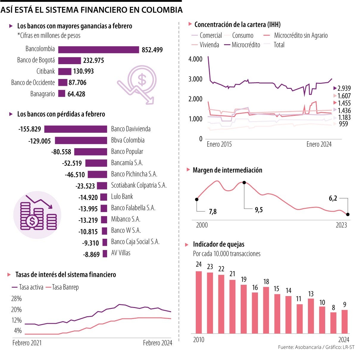 Al analizar todo el sistema, más allá de los bancos, los establecimientos de crédito reportaron utilidades por $924.540 millones, monto inferior al de febrero de 2023 cuando estas ascendieron a $1,8 billones. Además, los activos del sistema (propios y de terceros) alcanzaron $2.971,5 billones, con una variación anual real de -0,7%.