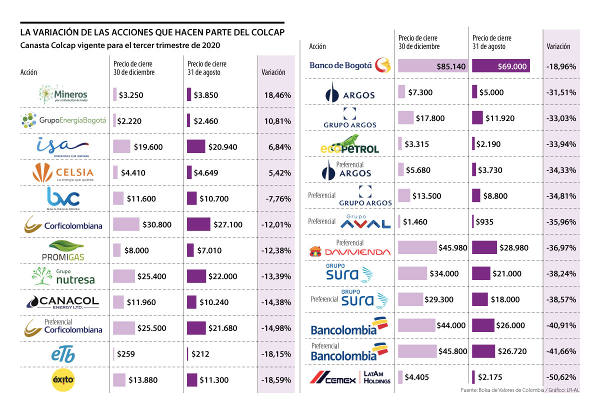 De las 25 acciones que hacen parte de la canasta del Colcap para el tercer trimestre del año, solamente las de Mineros, Grupo Energía Bogotá (GEB), ISA y Celsia finalizaron agosto con un precio superior al que registraron en la apertura del mercado el 2 de enero.
