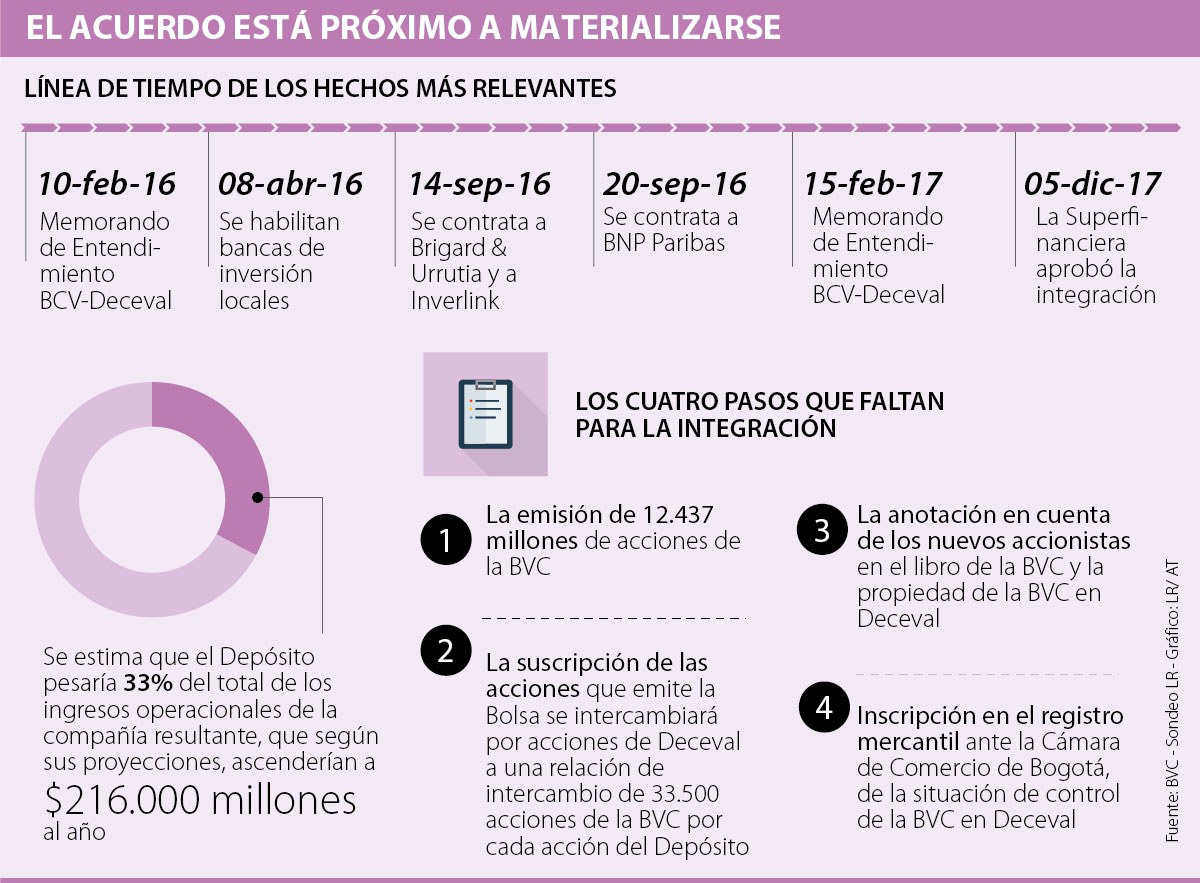 El siguiente paso será intercambiar las acciones que emitirá la Bolsa por títulos de Deceval en una relación de 33.500 acciones de la BVC por cada acción de la otra entidad involucrada. Según se explicó en la nota, el precio de cada una de las acciones a ser emitidas por la BVC, “será el promedio del precio de cierre de la cotización de la acción de la BVC en los 90 días calendario previos a la fecha de cierre”.