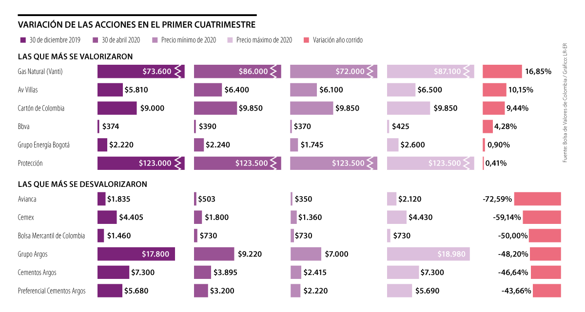 Por otro lado, la acción de la BVC que más se desvalorizó en los primeros cuatro meses del año fue la de Avianca, que cayó 72,59%, pues finalizó 2019 en $1.835 y el 30 de abril su precio de cierre fue $503. La volatilidad de esta especie ha sido tan alta en lo que va del año, que en el primer cuatrimestre su precio máximo fue $2.210, mientras que su precio mínimo fue $350.