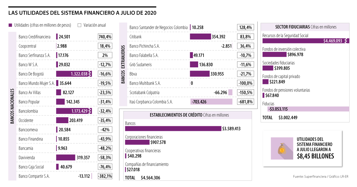 Las utilidades de los 25 bancos nacionales y extranjeros que operan en el país llegaron a un acumulado de $3,53 billones al cierre de julio de este año, es decir, 42,5% por debajo de los niveles registrados durante el mismo periodo de 2019, cuando las ganancias de estas entidades se ubicaron en $6,14 billones, según datos de la Superintendencia Financiera.