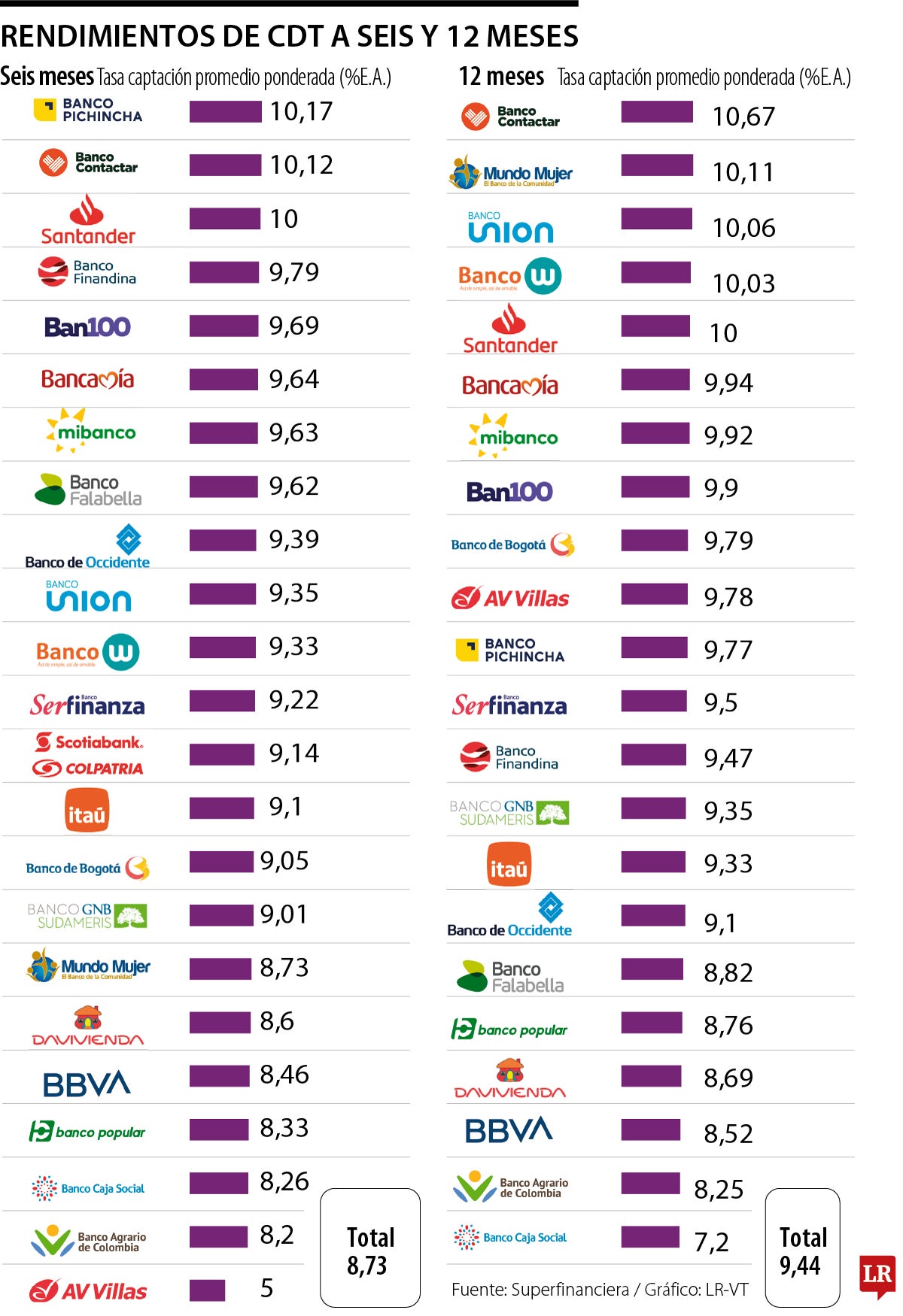 Los bancos que ofrecen las mejores rentabilidades a un año son Banco Contactar, Banco Mundo Mujer y Banco Unión, con tasas de interés E.A. de 10,67%, 10,11% y 10,06%, respectivamente. Los anteriores, junto a Banco W (10,03%) y Santander (10%), son los únicos que tienen intereses a doble dígito entre 22 entidades en ese plazo.