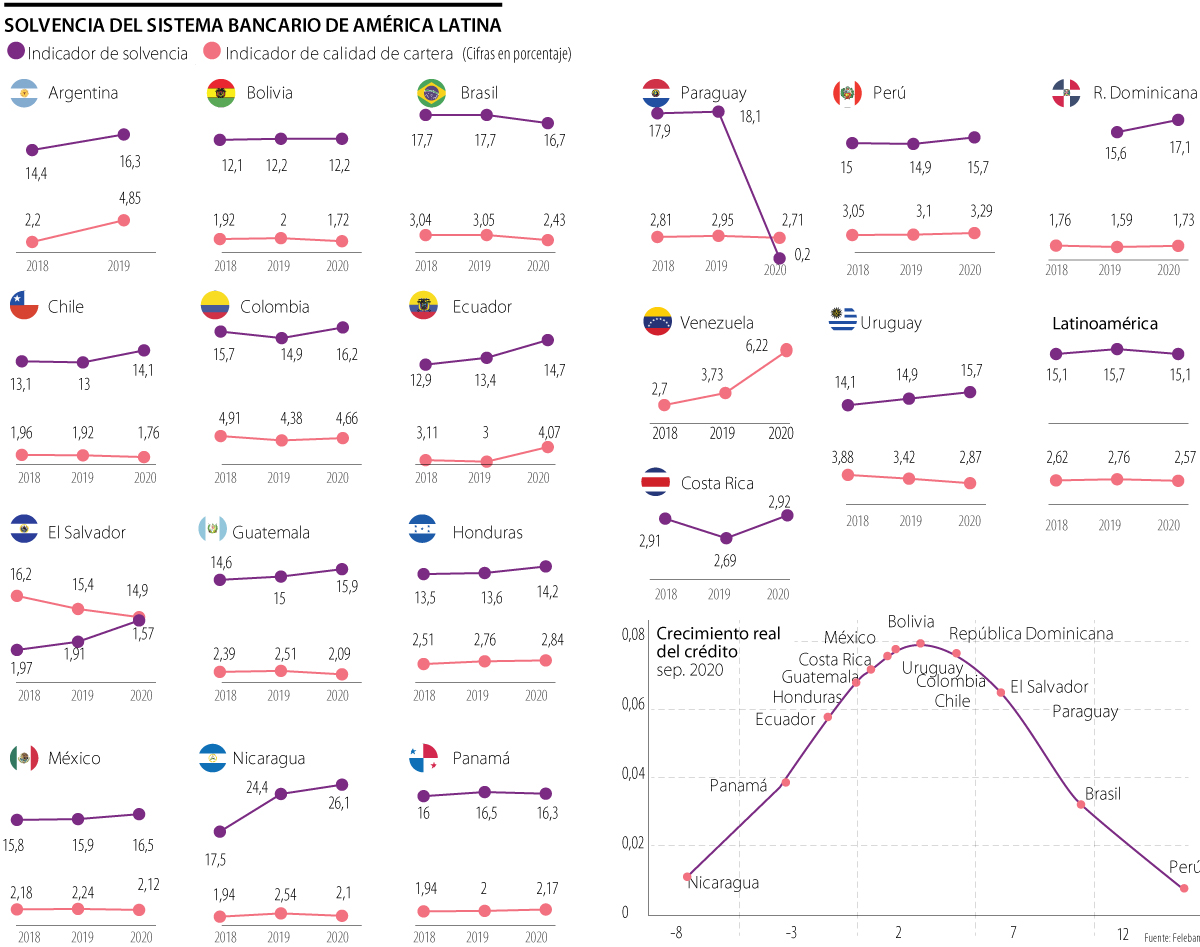 El promedio de este indicador en América Latina es de 15,1% con corte a septiembre, seis puntos básicos menos que en septiembre de 2019 y la misma cifra registrada en 2018, lo que significa que la solvencia bancaria de la región en 2020 volvió a niveles de hace dos años.