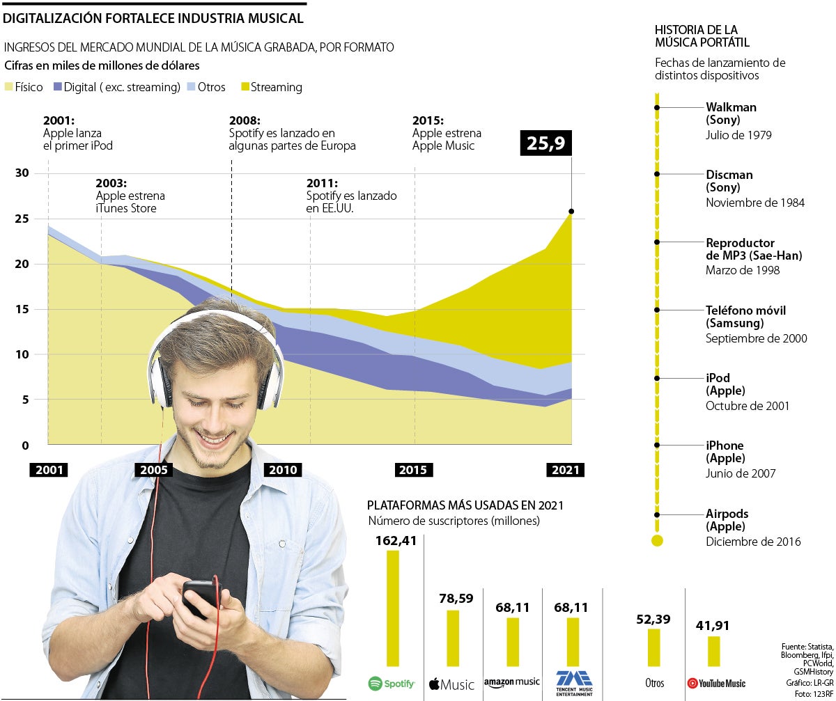 Según el último informe elaborado por la Federación Internacional de la Industria Fonográfica, los ingresos de la música grabada a nivel mundial ascendieron a US$25.900 millones el año pasado, esto es, casi un 18,5% más que los US$21.900 millones alcanzados en 2020.