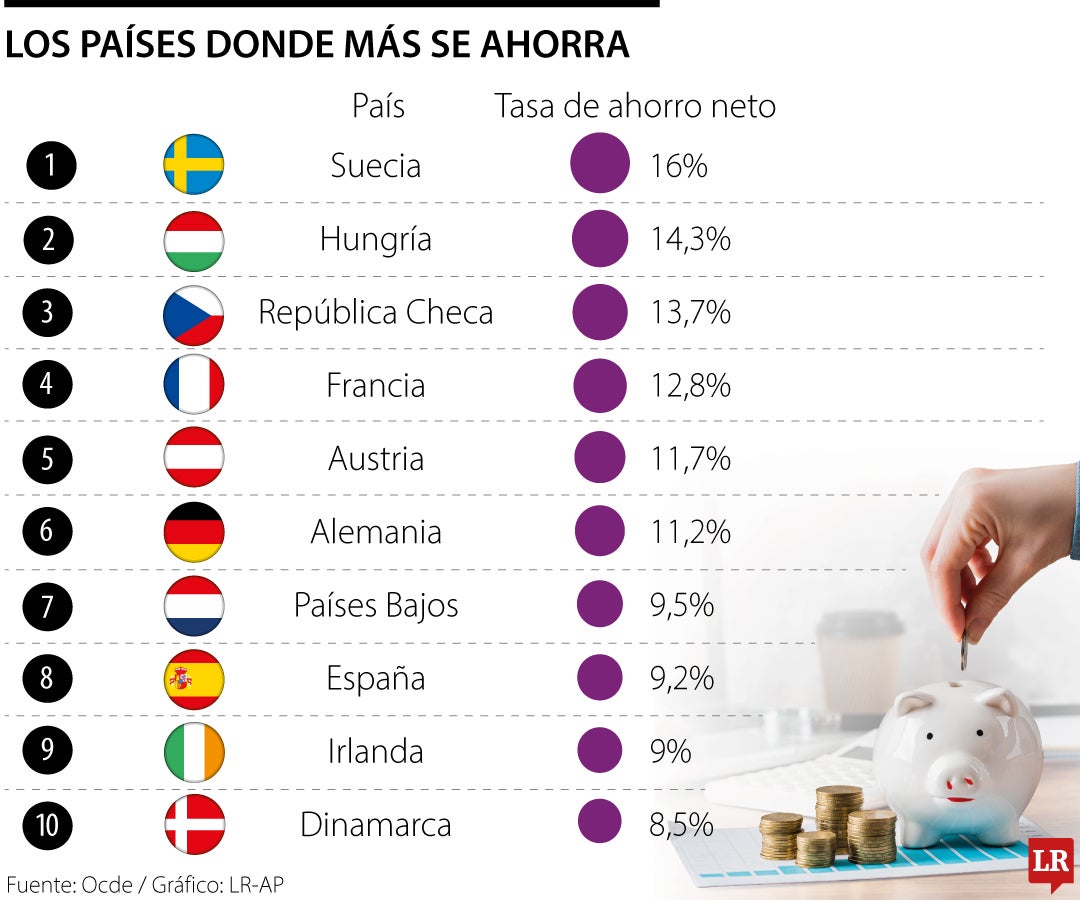 En el listado destacan en los primeros dos puestos Suecia y Hungría, con tasas de ahorro neto de 16% y 14,3% respectivamente. Le sigue República Checa con 13,7% y Francia con 12,8%.