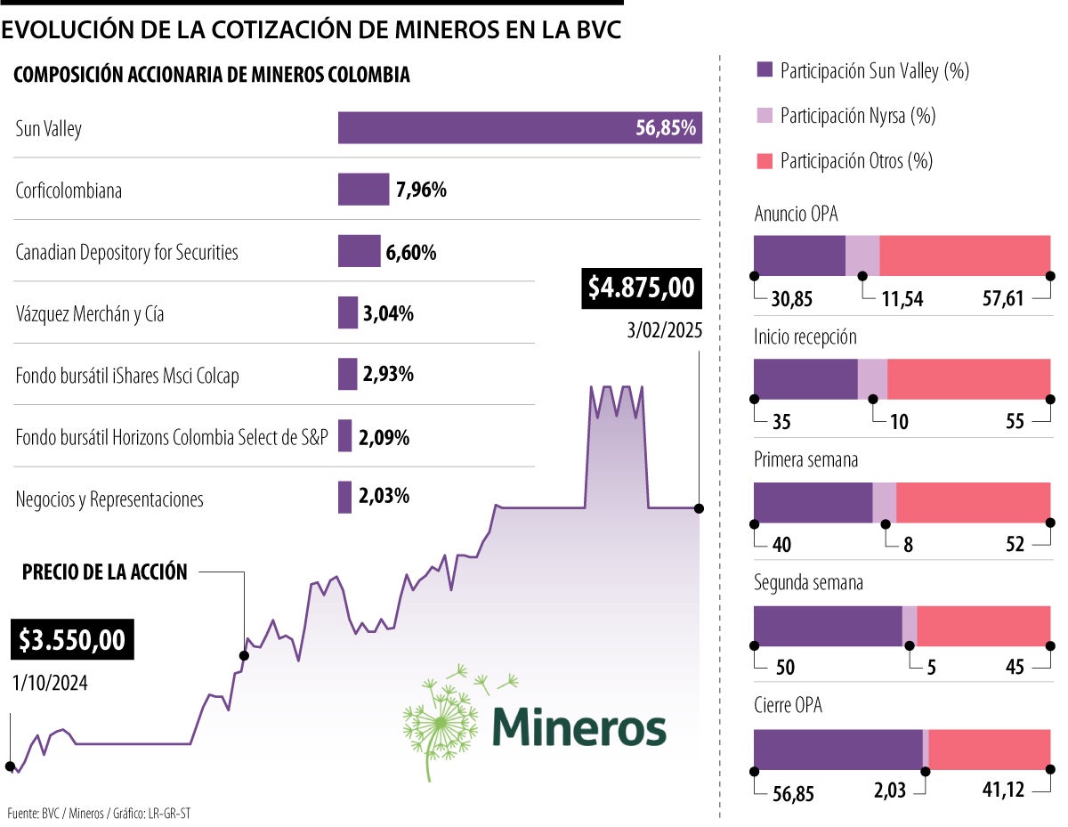 Mineros S.A. informó este viernes a sus accionistas que, como resultado de la Oferta Pública de Adquisición, OPA, lanzada por Sun Valley Investments, la firma ha incrementado su participación accionaria del 30,85% al 56,85%, consolidándose como el principal accionista de la compañía.