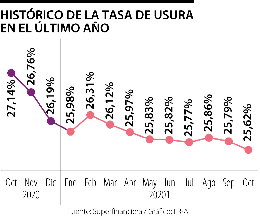 La Superintendencia Financiera de Colombia reveló que la tasa de usura para octubre bajó a 25,62%. El indicador retrocedió 17 puntos básicos si se compara con la tasa de septiembre (25,79%).