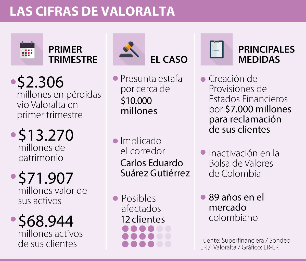 Valoralta tomó una serie de medidas después de dar a conocer que uno de sus trabajadores participó en un caso de fraude que aún está siendo investigado. Entre estas medidas, la de mayor impacto es la solicitud que hizo a la Bolsa de Valores el pasado lunes 13 de agosto de inactivarle. La firma adujo entonces que “las causas que llevaron a la decisión de suspender temporalmente las actividades corresponden al descubrimiento de un posible fraude atribuible a un exempleado de la sociedad”.