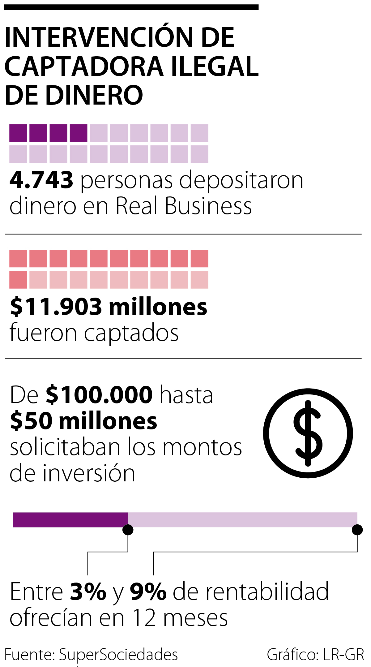 Dicha sociedad y las personas naturales intervenidas, recibieron recursos de4.743 personas. Hasta ahora, la Superintendencia de Sociedades ha logrado establecer que se captaron recursos por $11.903 millones, recibiendo supuestas inversiones que iban desde $100.000 hasta $50 millones.