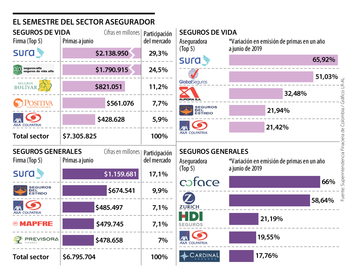 Suramericana y Seguros de Vida Alfa continúan como las firmas más fuertes en el negocio de vida, pues entre las dos alcanzaron 53,8% del total de pólizas emitidas en el mercado, al sumar $2,1 billones y $1,7 billones a junio de 2019, respectivamente,