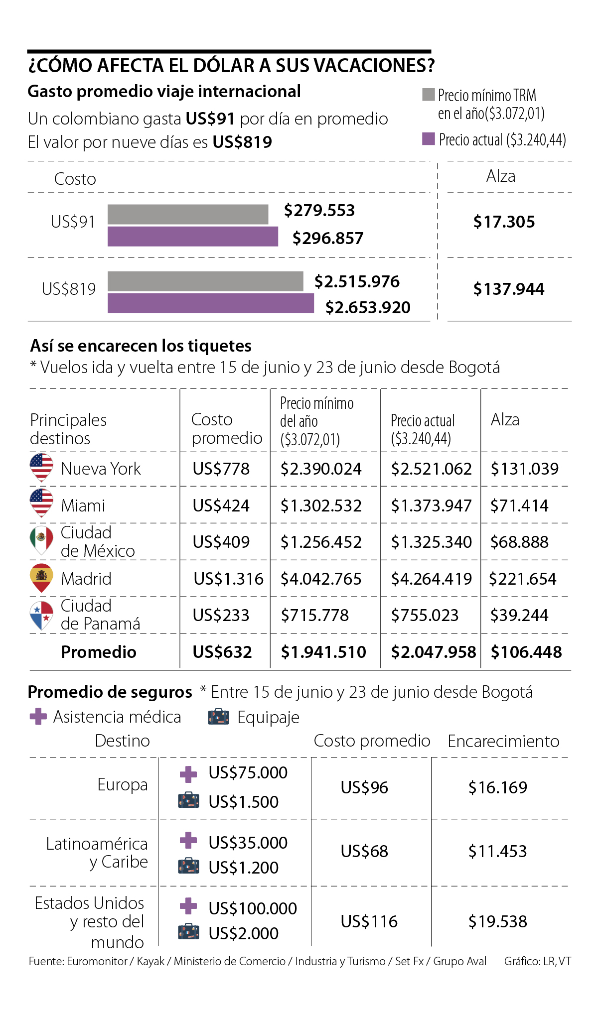 “Estas alzas en la divisa son estructurales, por lo que no se espera que sean de corto plazo y no es loco pensar que la TRM pueda llegar a $3.300”, dijo Juan David Ballén, jefe de investigaciones de Casa de Bolsa. Sin embargo, el analista resaltó que el precio no debe asustar a los viajeros “pues en las casas de cambio la moneda está muy por debajo y el consejo sería no gastar tanto en tarjetas”.