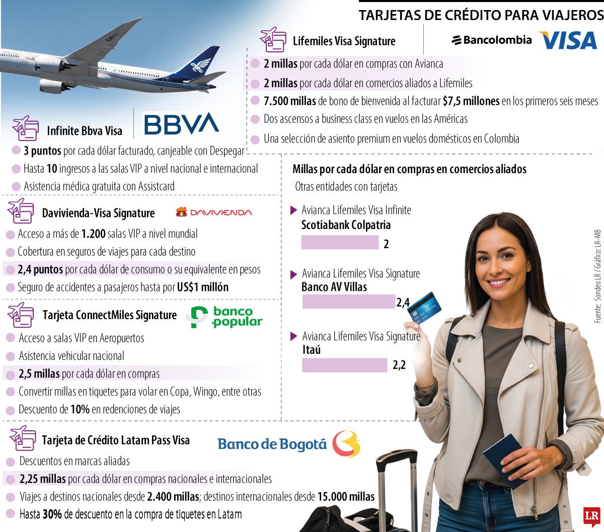 La oferta de bancos con tarjetas para viajeros es variada y es imperativo revisar todas las opciones para elegir la mejor. El Banco de Bogotá ofrece 2,25 millas por cada dólar en compras nacionales e internacionales. El usuario puede viajar a destinos nacionales desde 2.400 millas e internacionales desde 15.000 millas. Otras entidades como Scotiabank Colpatria e Itaú ponen a disposición 2 y 2,2 millas por cada dólar en compras en comercios aliados. A pesar de los beneficios de estos plásticos, Wells Fargo recomienda pagar el total de las cuentas cada mes, a fin de no perder las recompensas.