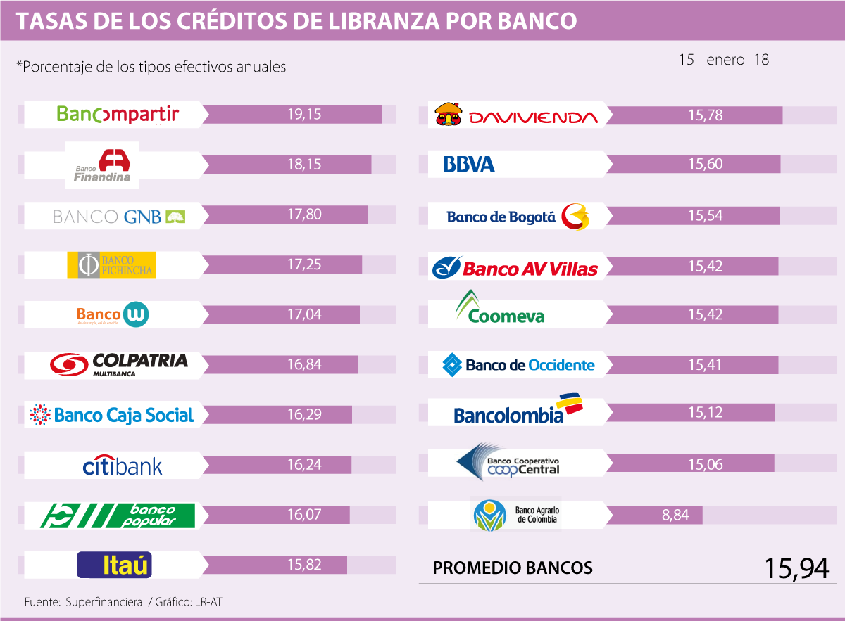 Pero a la hora de ver por entidad las tasas que se están ofreciendo, las cinco más favorables son las del Banco Agrario (8,84%), Coopcentral (15,06%), Bancolombia (15,12), Banco de Occidente (15,41%), y Banco Coomeva (15,42%). Mientras que las más altas están en Banco Compartir (19,15%), Finandina (18,15), GNB Sudameris (17,80), Pichincha (17,25%) y Banco W (17,04).