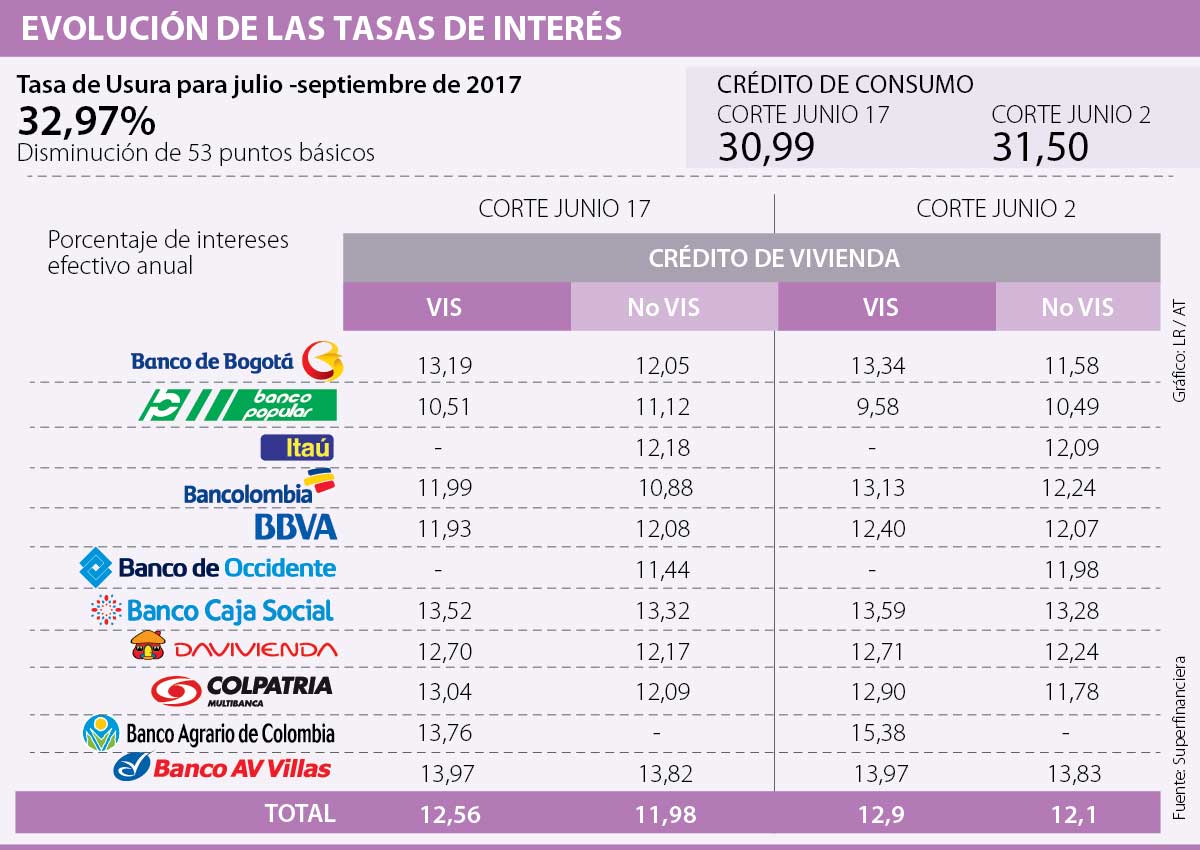 El cambio se vio con más fuerza en los créditos hipotecarios. Por ejemplo, el 2 de junio la tasa para compra de inmuebles nuevos o usados en la categoría de Vivienda de Interés Social (VIS), estaba en 12,95% efectivo anual, esta se redujo en 15 días a niveles de 12,56% E.A; mientras que por el lado del segmento no VIS, la tasa pasó de 12,17% a 11,98% E.A.