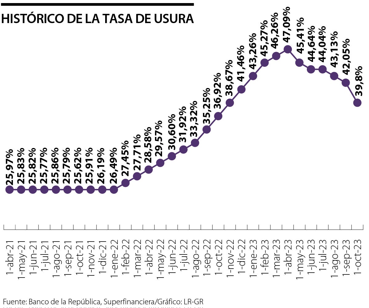 La Superintendencia Financiera de Colombia certificó que la tasa de usura continuará bajando para octubre, por lo que los bancos no podrán cobrar más de 39,80% por las tasas de interés; esto representó una caída de 225 puntos básicos frente a la tasa anterior de 42,05%.