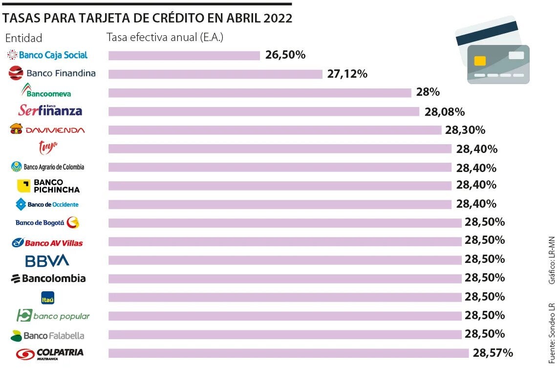 Las tasas más bajas son de Banco Caja Social (26,5%), Banco Finandina (27,12%), Bancoomeva (28%) y Serfinanza (28,08%).