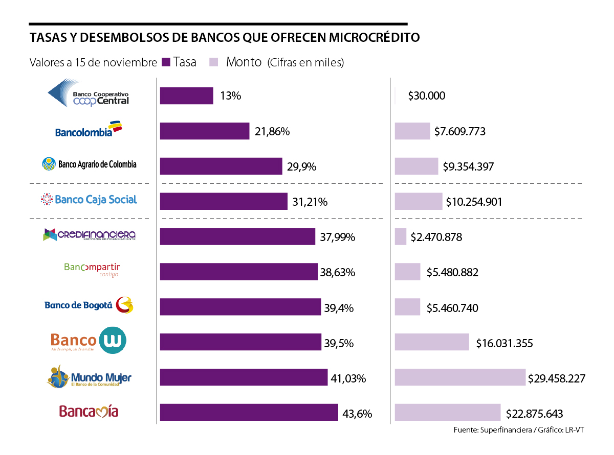 Las tres instituciones con las tasas más altas son el Banco W, con 39,5%, registra $16.031 millones; a este le sigue el Banco Mundo Mujer, que cuenta con un tipo de 41,03% y $29.458 millones, y Bancamía, cuyo interés es 43,6% y ha desembolsado $22.875 millones.