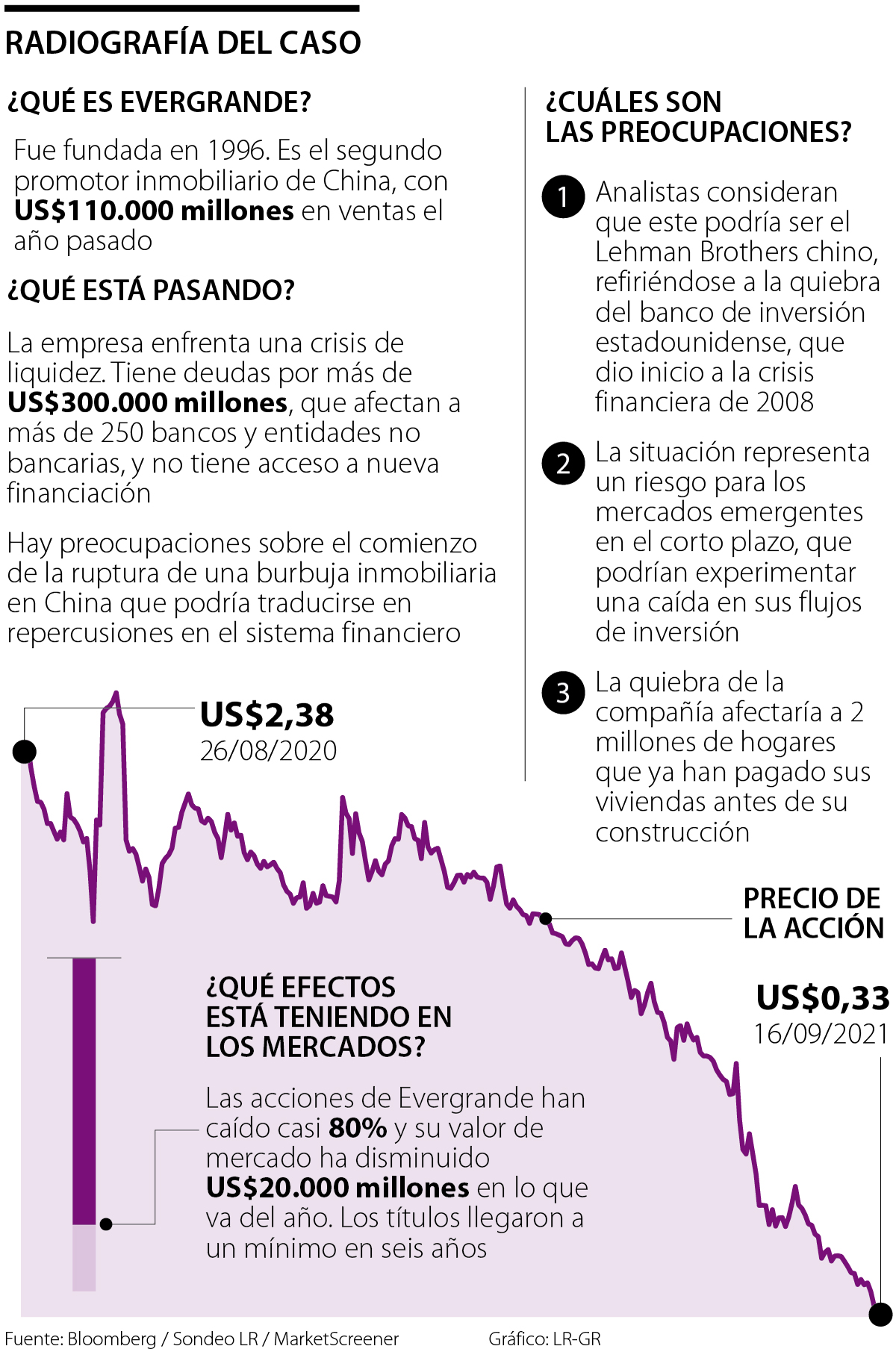 La situación de Evergrande ya está registrando su coletazo en los mercados. El valor de la compañía ha disminuido US$20.000 millones en lo corrido del año, pues su título ha perdido más de 80%. Las acciones de la empresa llegaron a un precio mínimo de seis años esta semana y solo en la jornada de ayer cayeron 6,41%.