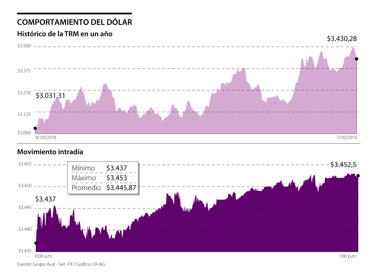 Así, en la sesión del lunes la moneda cerró en un valor promedio de $3.445,87, mientras que, tras la negociación de US$640,3 millones en 965 transacciones, el precio de cierre sobrepasó los $3.450, hasta un monto de $3.452,5.