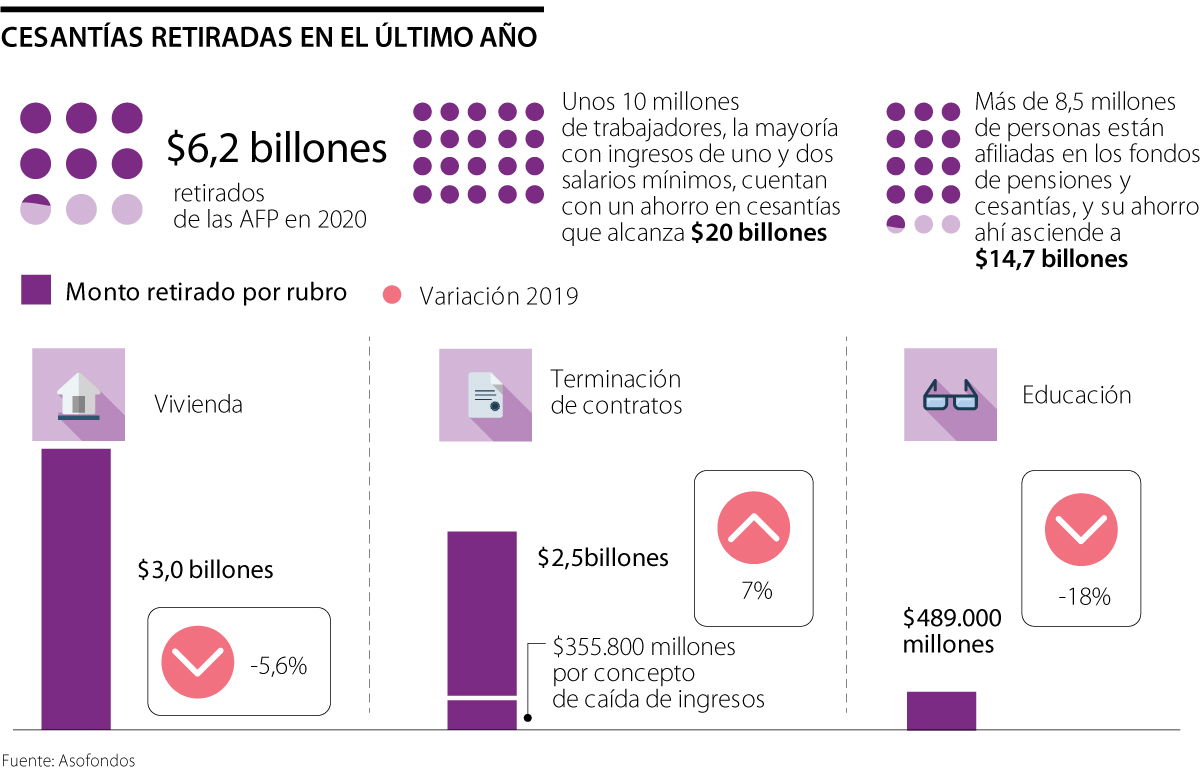El gremio reportó que en 2020 los trabajadores afiliados a Colfondos, Porvenir, Protección y Skandia retiraron $6,2 billones, de los cuales más de una tercera parte se explicó por terminación de contrato y caída de ingresos. Más exactamente, los colombianos retiraron $2,5 billones, por terminación de contrato de los cuales más de $355.800 millones fueron explicados por el nuevo concepto.