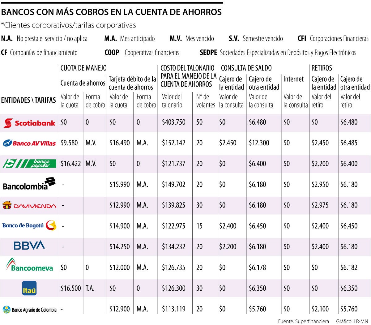 Por ejemplo, 10 de los bancos que manejan tarifas más elevadas son Scotiabank Colpatria, AV Villas, Banco Popular, Bancolombia, Banco Davivienda, Banco de Bogotá, Bbva, Bancoomeva, Itaú y Banco Agrario, sin embargo, en parte, esto suele explicarse por los costos de sus talonarios.