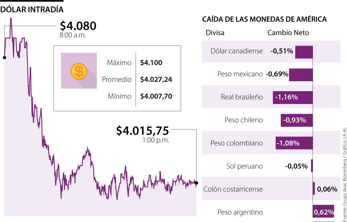Con lo anterior, ayer el precio del dólar registró una tendencia alcista, y cerró la jornada en un promedio de $4.027,24, lo que representó un aumento de $122,19 frente a la Tasa Representativa del Mercado (TRM) vigente este martes, que se ubicó en $3.905,05.