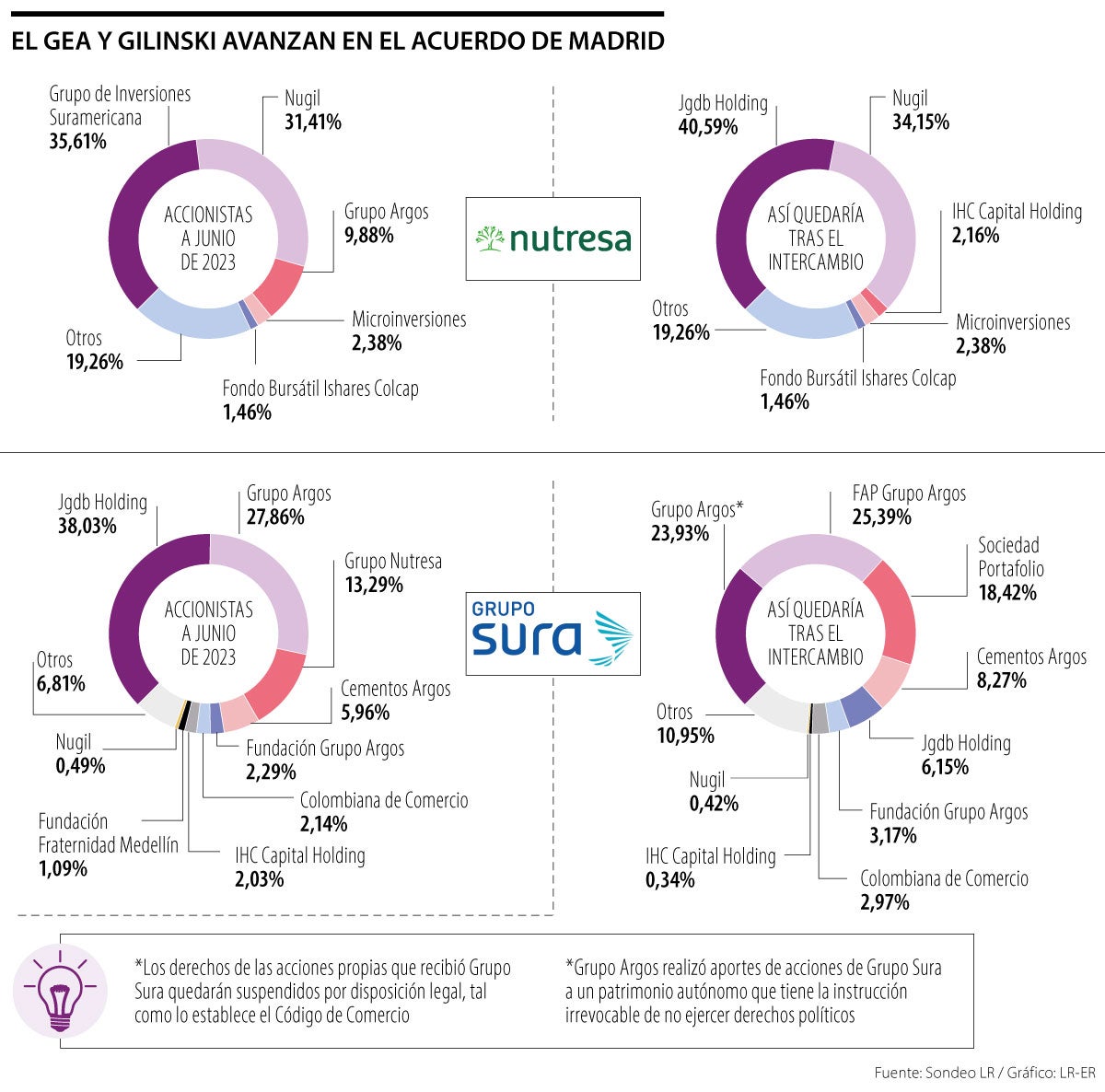 En el caso del Grupo Sura, Jgdb Holding, Nugil e IHC Capital entregaron 166 millones de acciones del conglomerado financiero a la misma Sura y al Grupo Argos. Sin embargo, el Grupo Gilinski mantendrá una participación, que luego será entregada en otro de los intercambios pactados en el Acuerdo de Madrid.