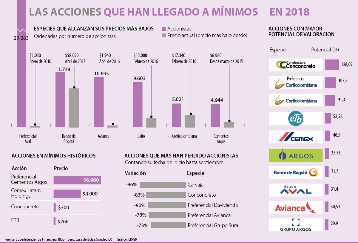 En total son 10 las especies que se encuentran en su nivel más bajo del año; entre ellas, seis como la preferencial de Grupo Aval, Banco de Bogotá, Avianca, Éxito, Corficolombiana y Cementos Argos, que resaltan por caer desde buenos niveles, incluso tocando precios mínimos que no veían desde hace ocho años, como en el caso de las especies de Corficolombiana.