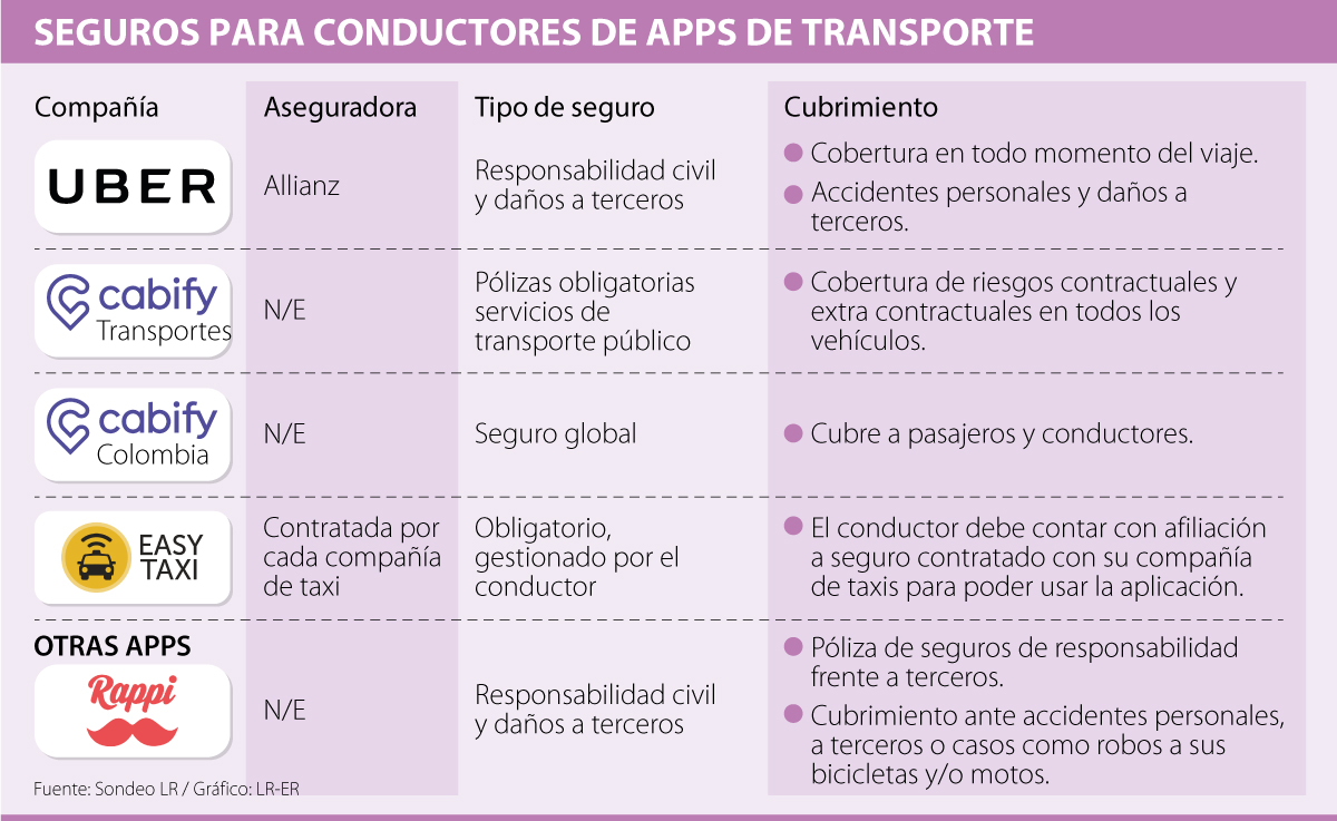 Esta semana se conoció que la compañía tecnológica de servicios de transporte Uber ofrecerá una póliza gratuita a todos los conductores y repartidores autónomos que trabajan para la empresa en Europa. Debido a esto, LR realizó una radiografía sobre las principales aplicaciones de servicios de transporte y la cobertura en seguros que ofrecen a sus colaboradores en Colombia.