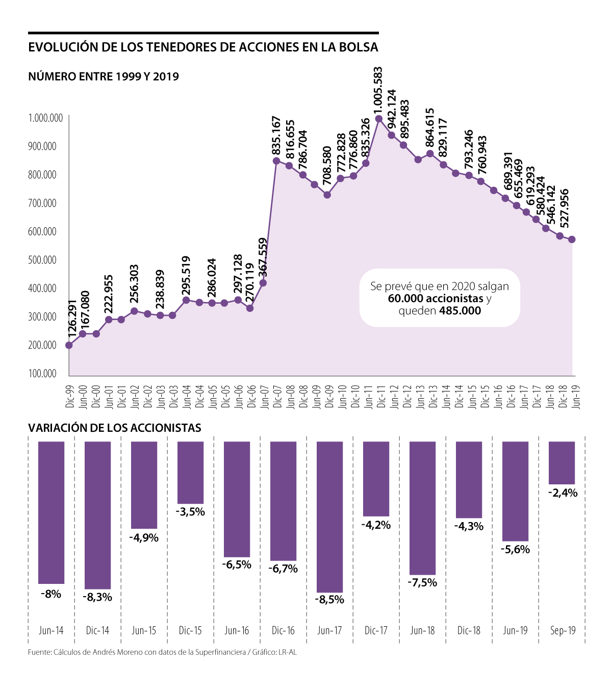 De acuerdo con el analista bursátil Andrés Moreno, quien realizó un informe sobre los inversionistas del sector financiero en la Bolsa con base en las cifras reportadas a la Superintendencia Financiera, desde 2011 a septiembre de este año, el mercado accionario perdió 474.329 accionistas y se prevé que a finales de año esta cantidad aumentaría a 500.000 personas.