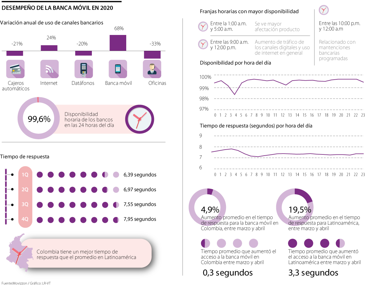 El monitoreo reveló que durante 2020 el tiempo de respuesta de la banca móvil creció. Para el primer trimestre del año se estableció en 6,39 segundos, en el segundo 6,97, en el tercer periodo del año fue 7,55 segundos y para el último la cifra se ubicó en 7,95, en lo corrido del año hubo un aumento absoluto de 1,5 segundos.