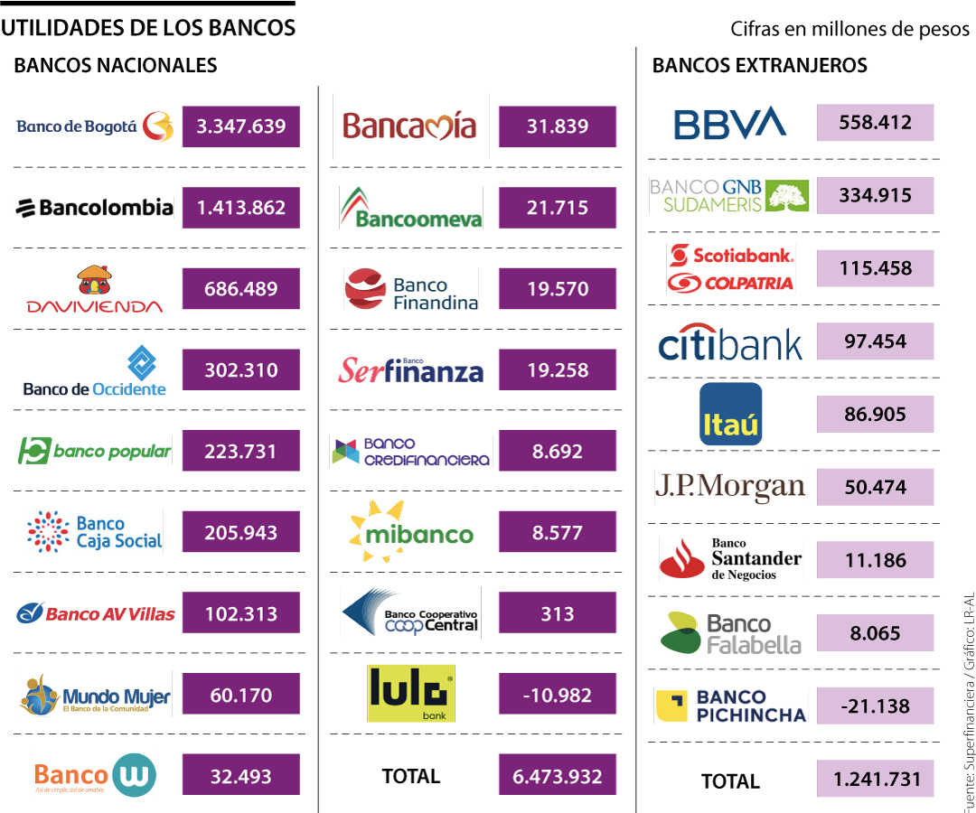 Los bancos nacionales que más registraron ganancias en el sistema fueron Banco de Bogotá, con utilidades por $3,3 billones; Bancolombia, con $1,4 billones; y Davivienda, con $686.489 millones. Hay 17 bancos privados nacionales y solo uno presentó pérdidas, Lulo Bank presentó un déficit de $10.982 millones.