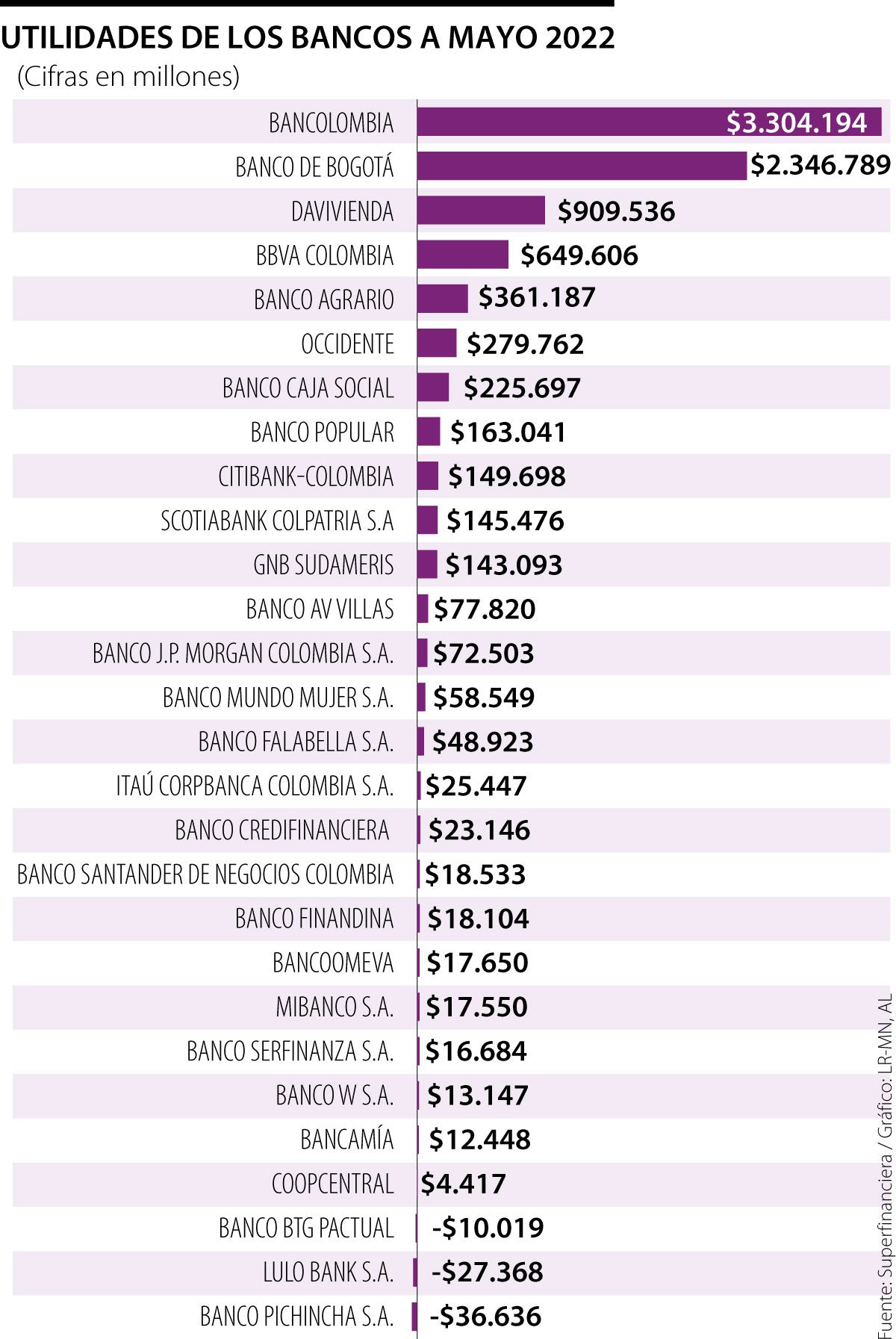 Si se hace el ranking por bancos nacionales, Bancolombia sigue liderando, con ganancias que suman los $3,3 billones. De cerca le sigue Banco de Bogotá, con $2,3 billones y Davivienda completa el top tres, con $909.536 millones.