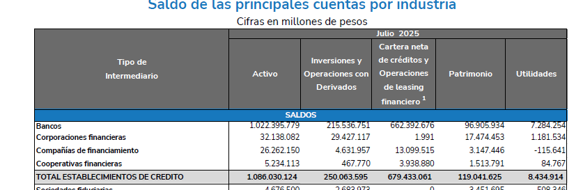 De acuerdo con la Superintendencia Financiera, los bancos reportaron utilidades por $7,28 billones a julio de 2025, cifra superior en 58% frente al mismo periodo de 2024, cuando habían sumado $4,6 billones. En conjunto, los establecimientos de crédito –bancos, corporaciones financieras, compañías de financiamiento y cooperativas– alcanzaron $8,43 billones en utilidades, con un avance superior 80% anual.