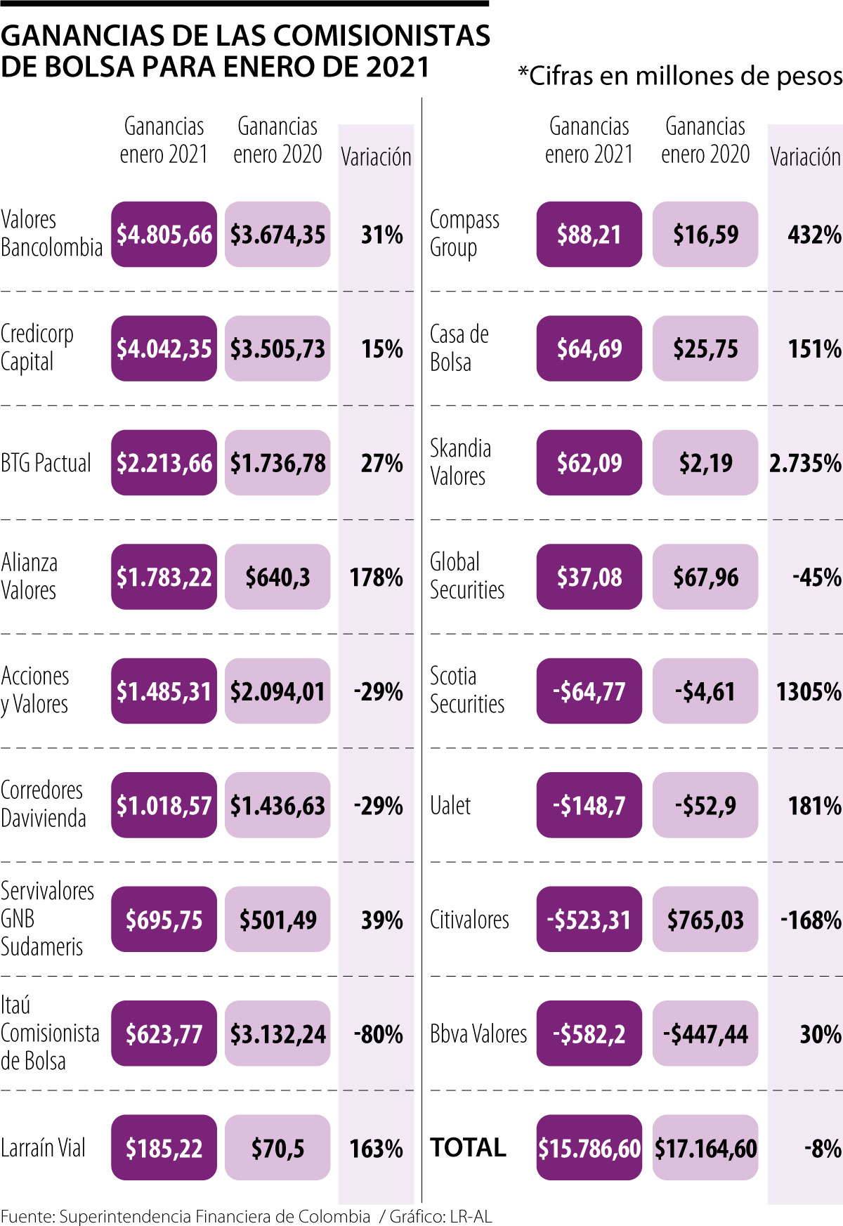 El último informe de las firmas comisionistas de bolsa activas y vigiladas por la Superintendencia Financiera de Colombia reveló que, para enero de 2021, las ganancias de la industria sumaron $15.786,6 millones, lo que representó una caída de 8% frente al mismo mes del año anterior.