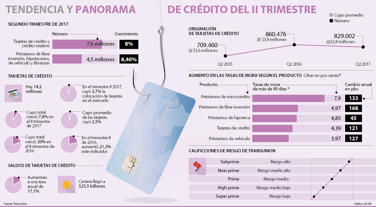 TransUnion maneja cinco calificaciones de riesgo, y en todas se evidenció una desaceleración en el segundo trimestre, aunque especialmente esta tendencia se nota en el segmento de subprime (riesgo alto), en el cual se redujo casi 25% la colocación de nuevas tarjetas.