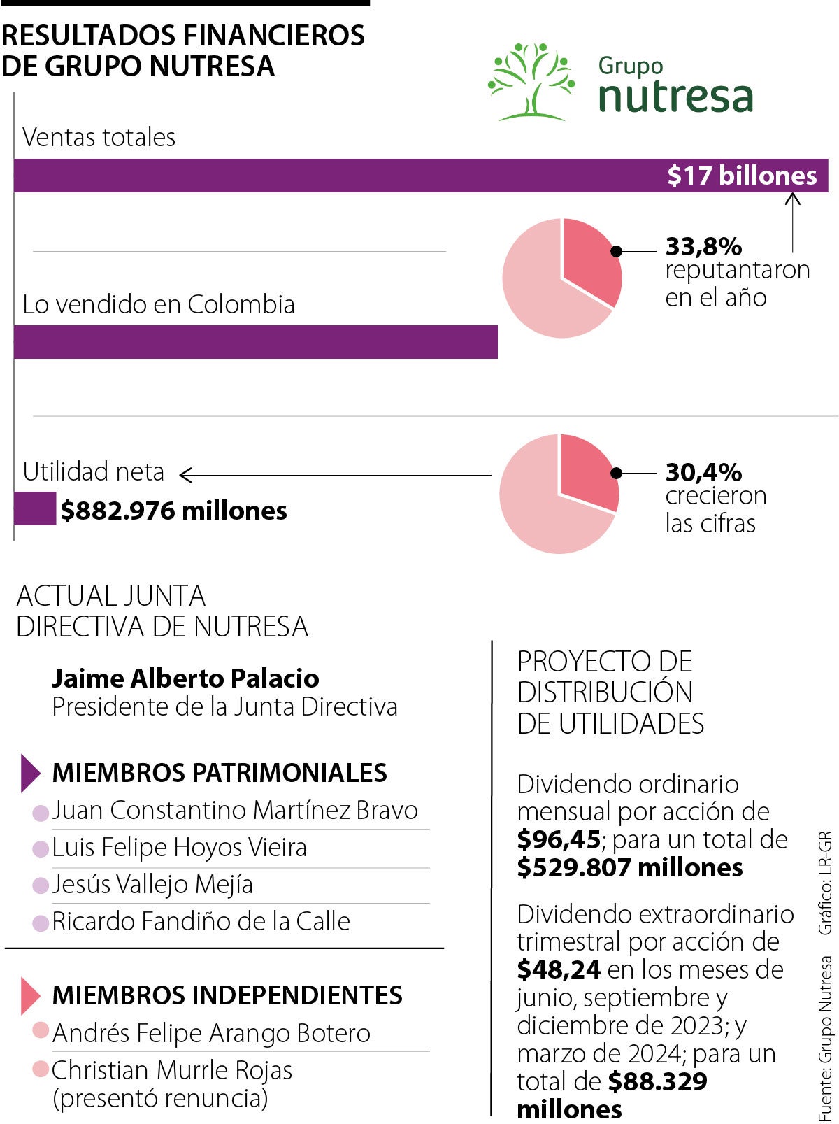 En la asamblea realizada ayer, la junta directiva de Grupo Nutresa aprobó el proyecto de distribución de utilidades para el periodo comprendido entre abril de 2023 y marzo de 2024. De la utilidad neta de $883.029 millones se repartirán $618.135 millones, lo que corresponde a un dividendo anual por acción de $1.350, que se pagará de la siguiente manera: un dividendo ordinario mensual por acción de $96,45 y un dividendo extraordinario trimestral por acción de $48,24 en los meses de junio, septiembre y diciembre de 2023; y marzo de 2024; para un total de $88.329 millones.