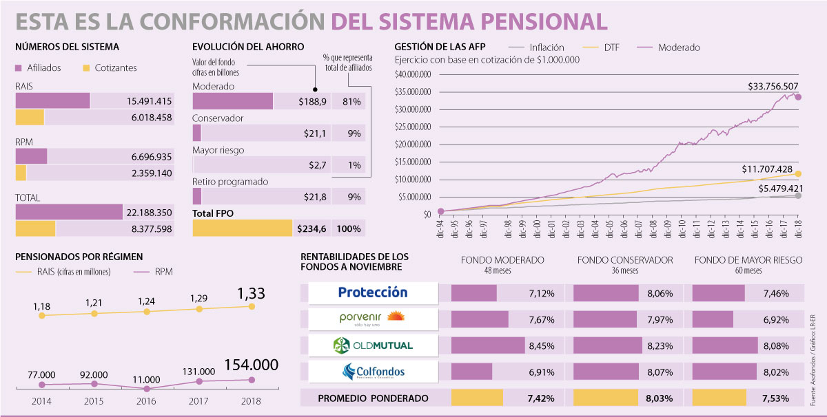 En cifras generales, en el régimen privado hay 15,4 millones de personas que han cotizado por lo menos una vez a pensiones, y en cotizantes, que son los más activos, el año pasado se llegó a más de 6 millones de personas. Por otro lado, en el Régimen de Prima Media público que administra Colpensiones, los afiliados llegaron a 6,6 millones de afiliados y 2,3 millones de cotizantes, para tener un total a corte de 2018, entre los dos regímenes, de 22,1 millones de afiliados y 8,3 millones de cotizantes.