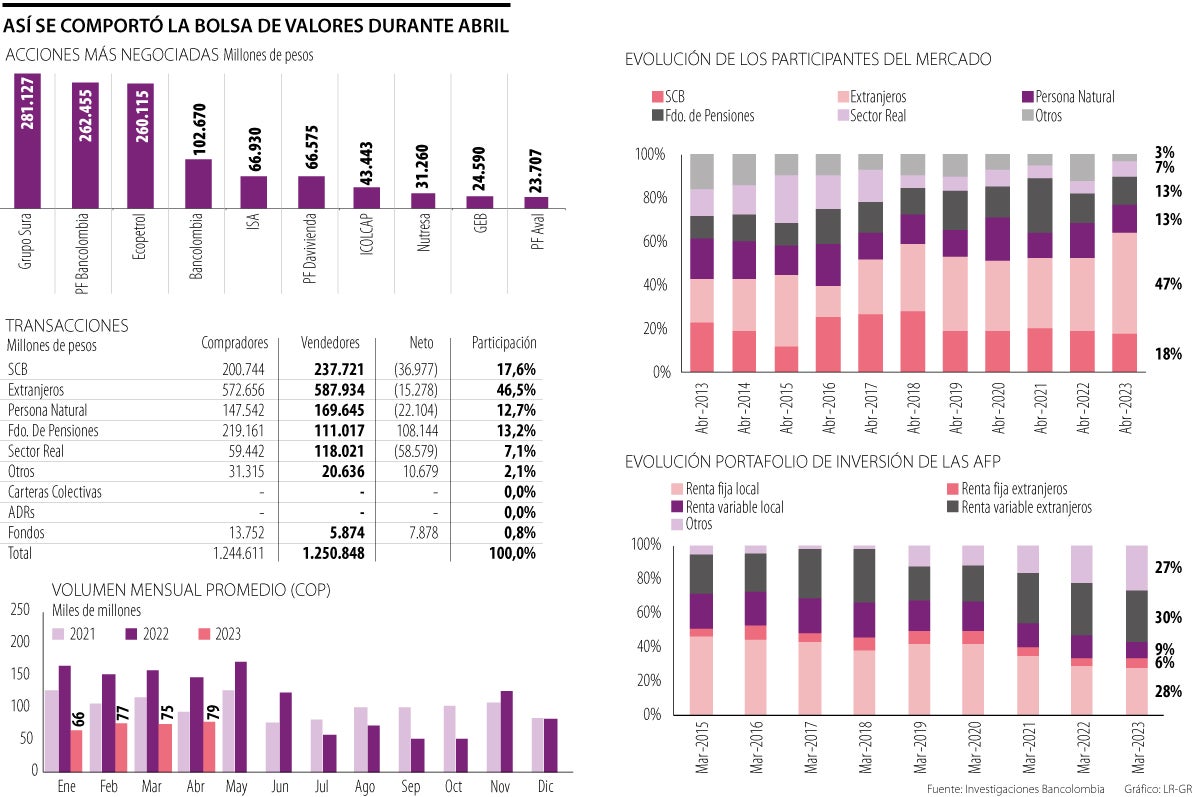 Además, el informe también destaca que todavía se presenta una fuerte caída en los volúmenes de negociación y se ve un retroceso de 53,1% frente a abril de 2022. Estos son los volúmenes más bajos en más de 14 años.