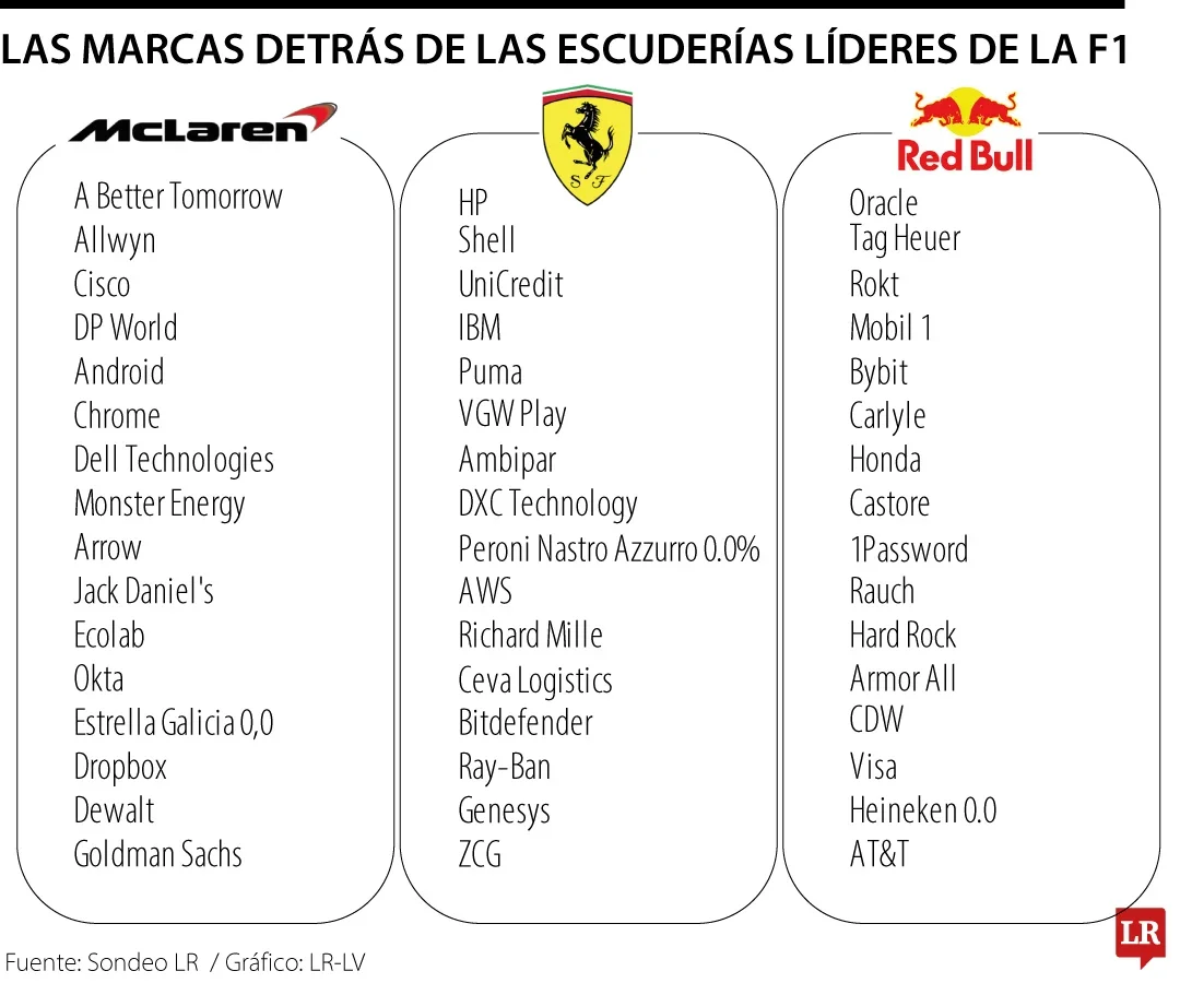 Detrás de McLaren, Ferrari y Red Bull hay empresas patrocinadores como Cisco, A Better Tomorrow, HP, Shell, Oracle y Mobil